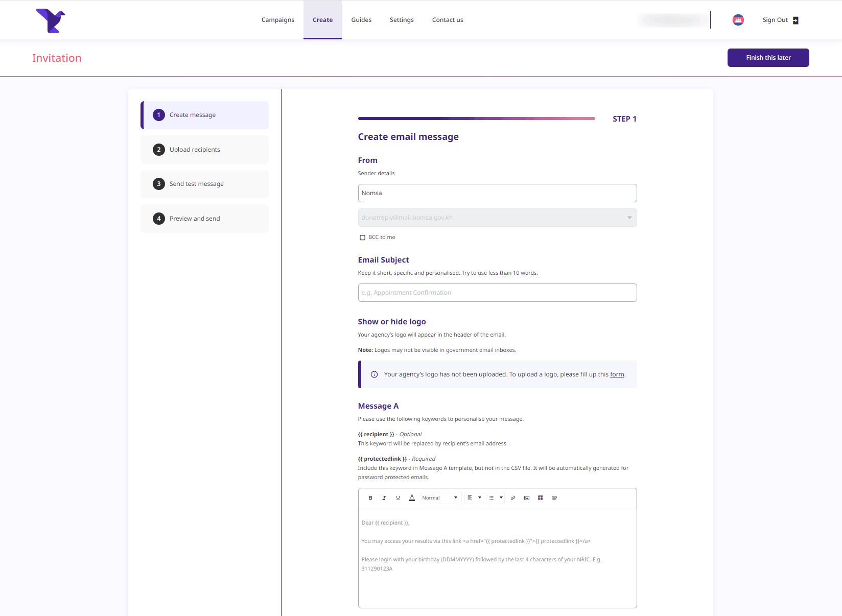 This is a generic message that will be delivered to the recipient's email inbox. Nomsa will generate the unique link called `{{protectedlink}}` for you but you must include a {{protectedlink}} field as a placeholder in the generic Message A template for us to generate the link.You should ensure that the recipient knows how to unlock the password-protected page in this message.An example message might be: `Please click on the following link {{protectedlink}} to open your private content. To open the password-protected email page, please enter the last 4 characters of your NRIC, including the letter in uppercase, followed by your date of birth in DDMMYYYY format. For example, if your NRIC is "T1234567A" and your birthdate is "13 January 2004", the 12-character password will be "567A13012004"`.