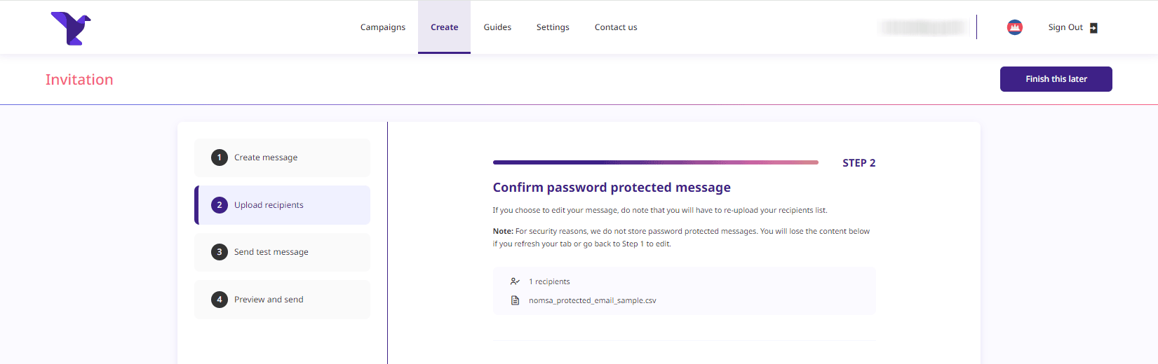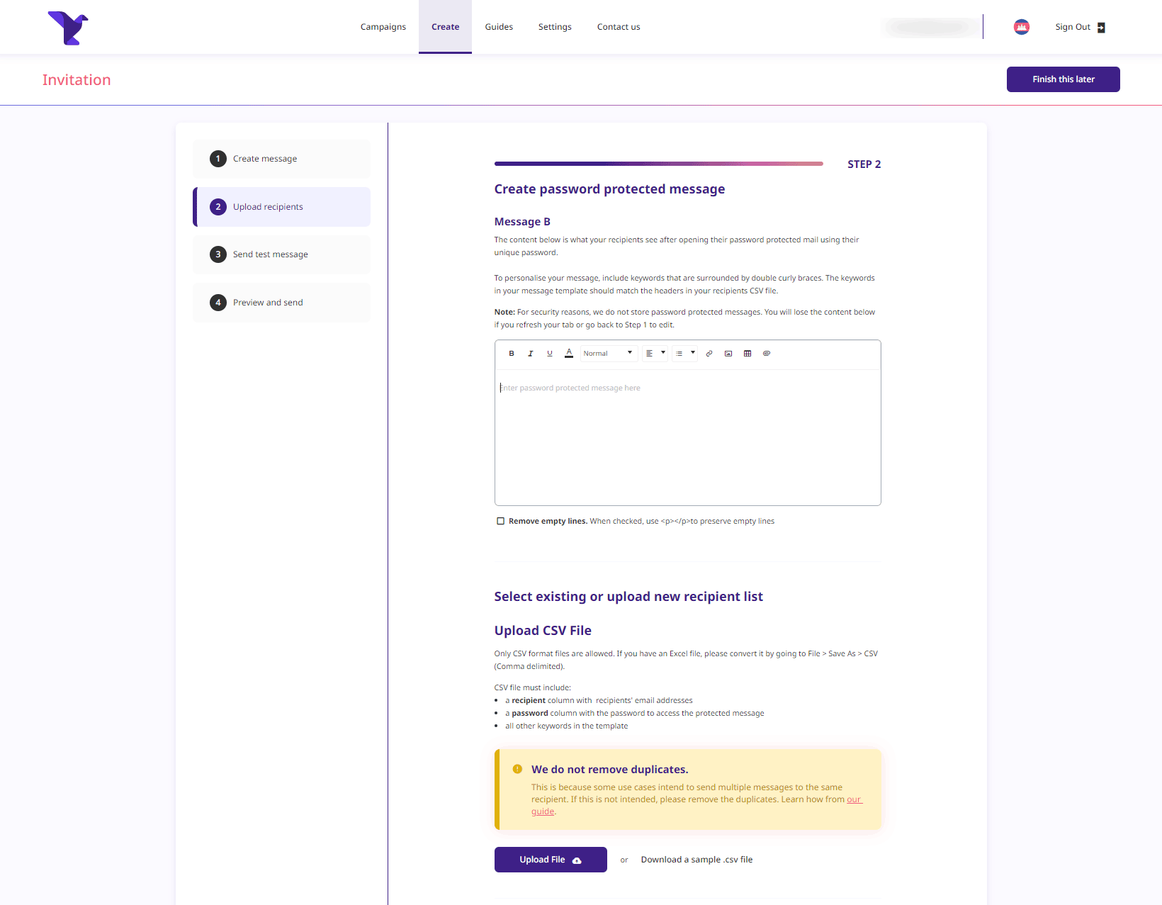 Once you have uploaded your CSV file, you will see the preview of the first recipient in your excel.